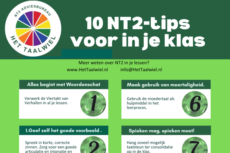 Op de vraag ‘hoe help ik een NT2-leerling in de klas?’ is geen eenduidig antwoord te geven. Een NT2-leerling heeft meer nodig dan alleen hulp bij het leren van Nederlands. Om een begin te maken met wat nodig en mogelijk is, schreven wij de ’10 NT2-tips voor in je klas’. Kijk eens op www.hettaalwiel.nl voor wat wij voor jou en je collega’s kunnen betekenen in het onderwijs aan deze bijzondere leerlingen.